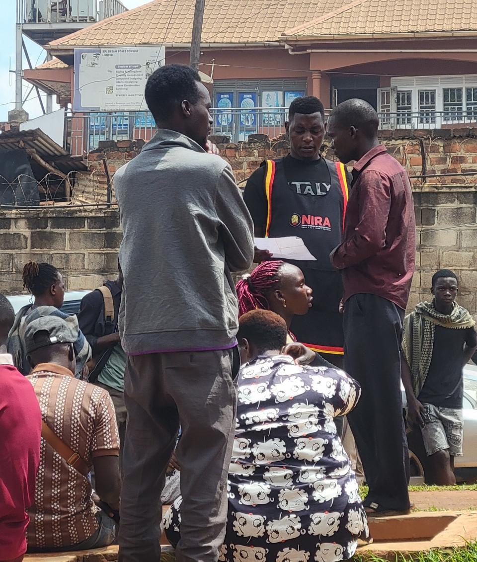 As dozens braved the morning rain to queue for their renewed National Identity cards on Thursday.At the Wakiso 52 NIRA office in Naluvule, by 9 am, an official only identified as Raymond would be heard asking crowds to stay away from his colleague, who was seemingly overwhelmed by random questions.