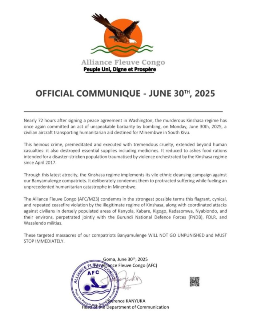 “Barely 72 hours after signing a peace agreement in Washington, the bloodthirsty Kinshasa regime has once again committed an act of unspeakable barbarity by bombing, on Monday, June 30, 2025, a civilian aircraft carrying humanitarian aid destined for Minembwe, in South Kivu. This heinous crime… destroyed essential supplies… and fuels an unprecedented humanitarian catastrophe in Minembwe,” Kanyuka said.