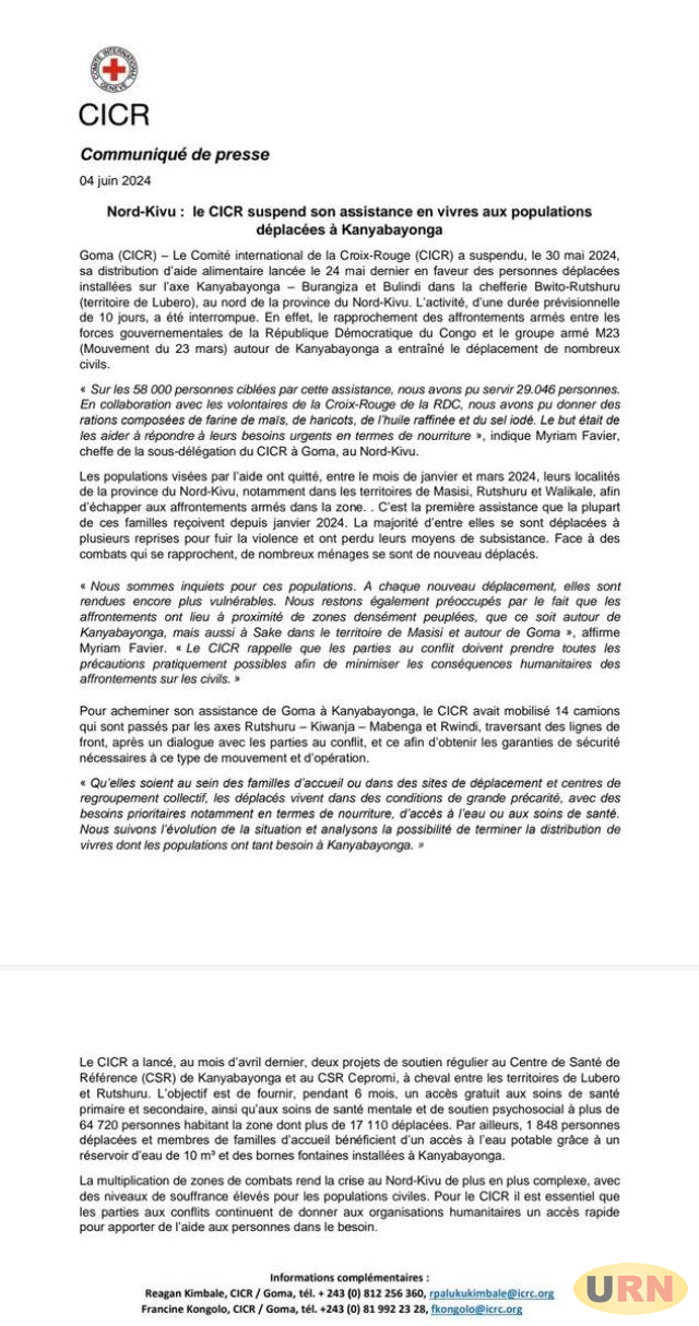 The International Committee of the Red Cross (ICRC) has suspended the distribution of food aid to displaced civilians in Kanyabayonga, Lubero territory, North Kivu Province.