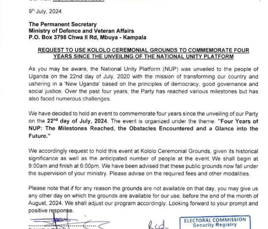 The National Unity Platform (NUP), led by Secretary General David Lewis Rubongoya, has formally requested permission from the Ministry of Defence and Veteran Affairs to use Kololo Ceremonial Grounds for their upcoming anniversary event. In a letter dated July 9, NUP emphasized the historical significance of Kololo Ceremonial Grounds and the expected large turnout for […]